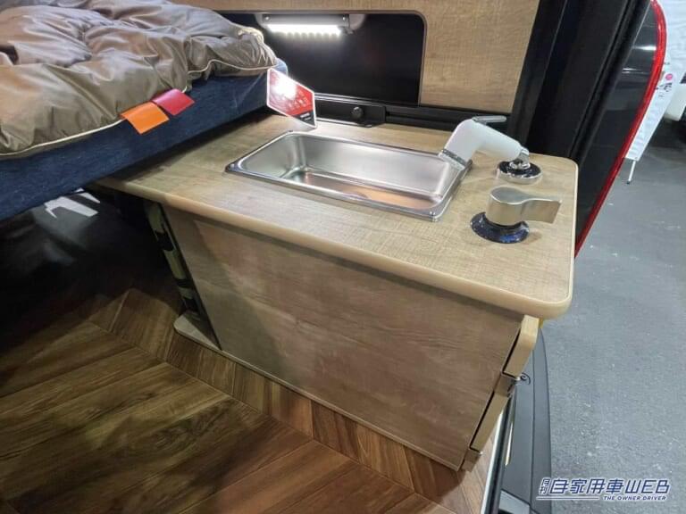フロアの左右には、ポータブル電源を設置できる棚とシンクが配置されている。