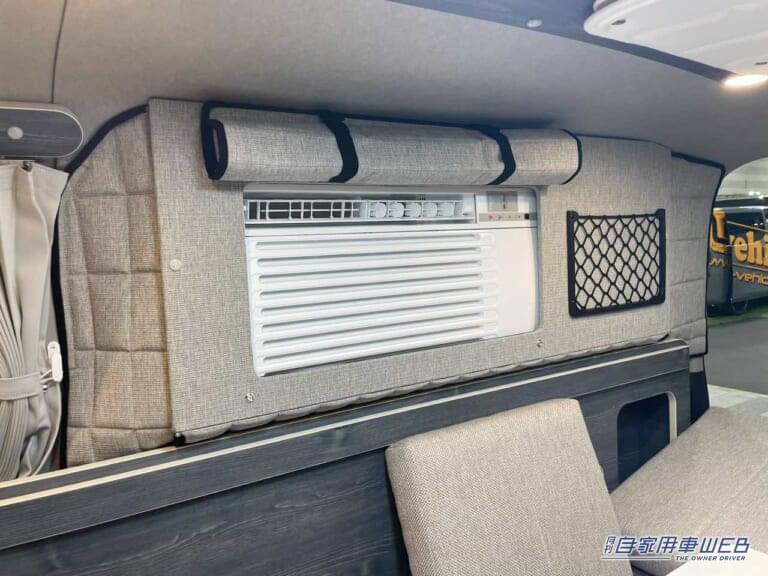右側の壁面にはエアコンが設置されている。カバーがつけられており、インテリアに溶け込むような工夫がされている。