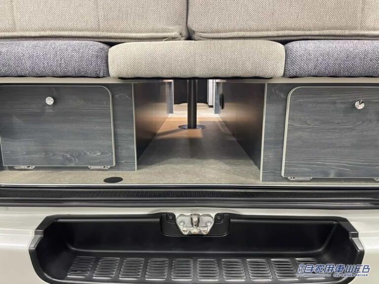 荷室の大部分はボックスシートが占めている。テーブルと背もたれを移動するだけですぐにフルフラットに変更できる。