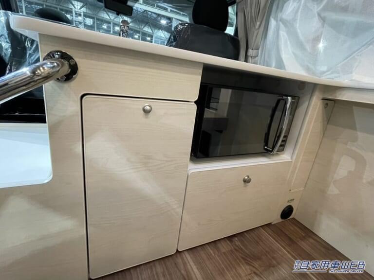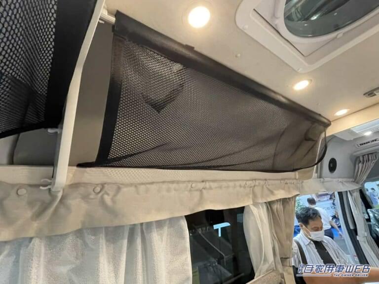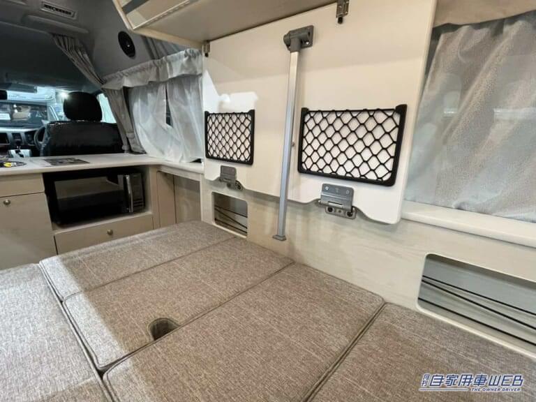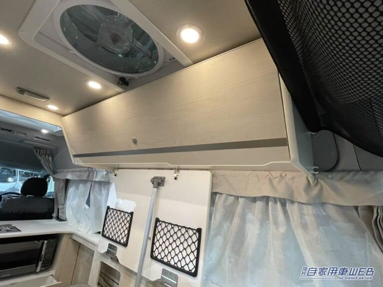 天井には大きな換気扇も取り付けられている。車内右側上部には大きな棚が設置されており、収納力も高い。また、テーブルは跳ね上げ式で展開・収納がラクラク。シートにはテーブルの脚が入る穴が設けられているため、フルフラットになった状態でテーブルを使うことができる。