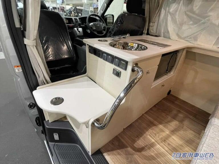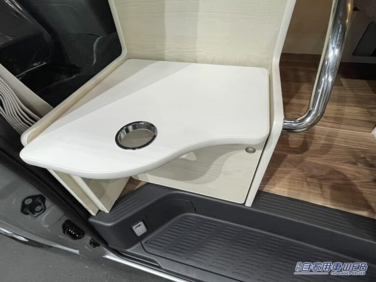 1列目のシートの後ろにはキッチンカウンターが設置されている。ドリンクホルダーが設置された小さめのテーブルは、車外に椅子を置いて使うには最適な場所に位置。