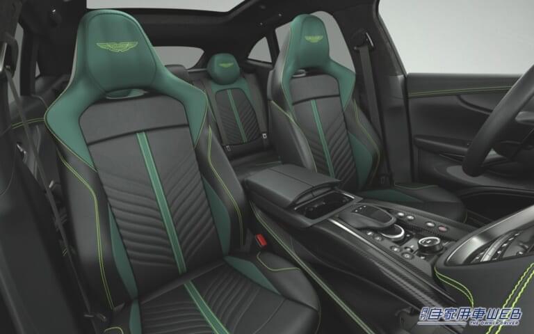 専用のサテンオベロンブラック塗装を施した彫刻的なカーボンボディキットは、AMR23 F1®カーやF1®のオフィシャルメディカルカーを彷彿とさせるライムのアクセントでさらに引き立てられている。さらにユニークなカラーとトリム・パレットは、その存在感と強烈なパフォーマンスを際立たせる。