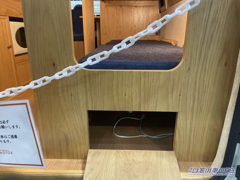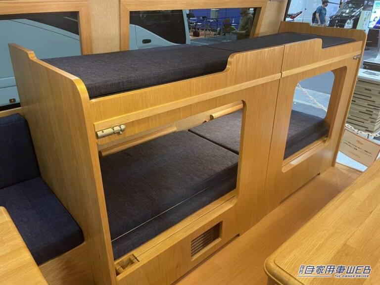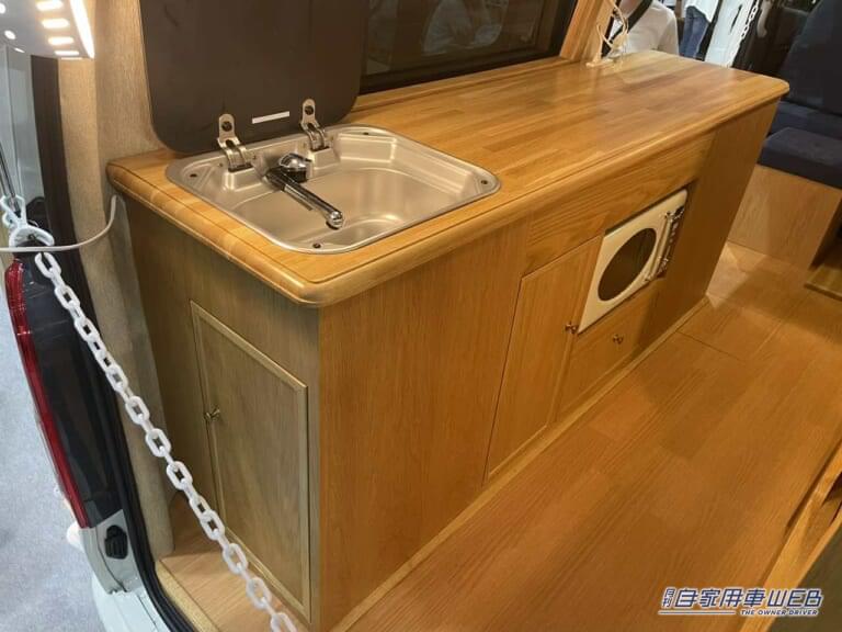 車内後部はキッチンカウンターと二段ベッドという作りになっている。どちらも木材をふんだんに使っており、木目の美しさが感じられる。