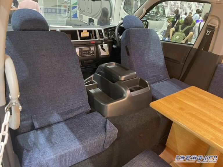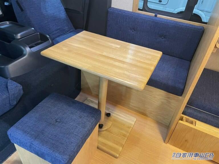 運転席と助手席は、前に倒すと背面がシートになる仕組み。テーブルは適度なサイズ感で、車内での移動の際も邪魔にならない。
