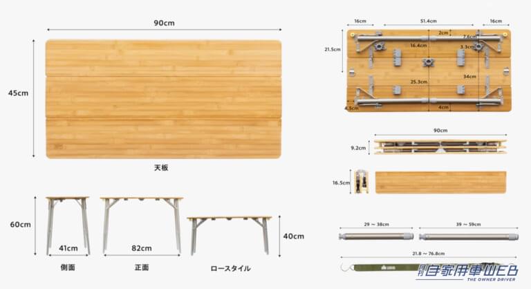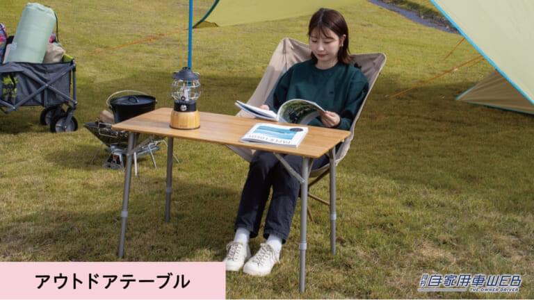 「アウトドアテーブル」は、本体と一体型の脚フレームを立てて使用する。40~60cmの好みの高さに無段階調節が可能で、ロースタイルにも対応している。