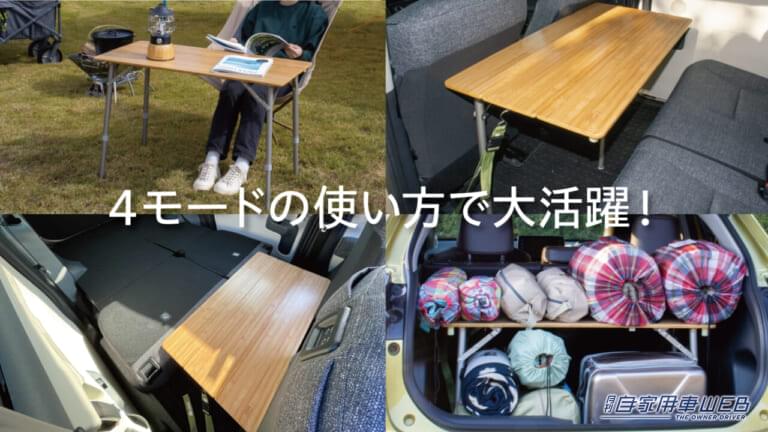 「アウトドアテーブル」としての使用に加え、車内の様々なシーンに合わせた使い方が可能です。食事やリモートワークに大活躍する「リア席テーブル」、フラット部分を拡張し足を伸ばしてゆったり眠ることができる「リアフルフラット(車中泊)」、ラゲッジ部分の収納力が向上する「デッキ棚」の4モードの使い方が可能。