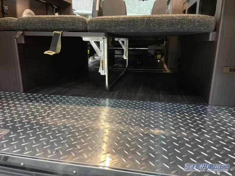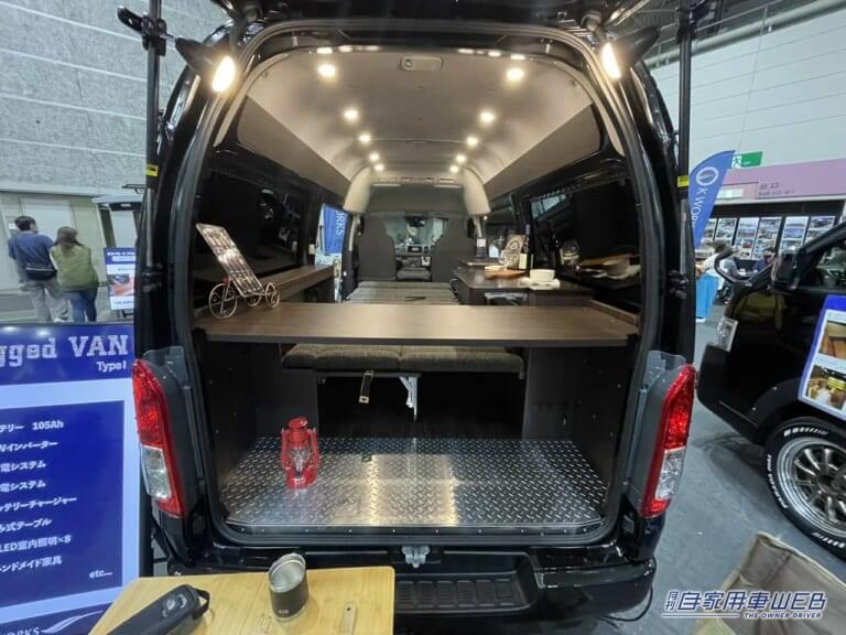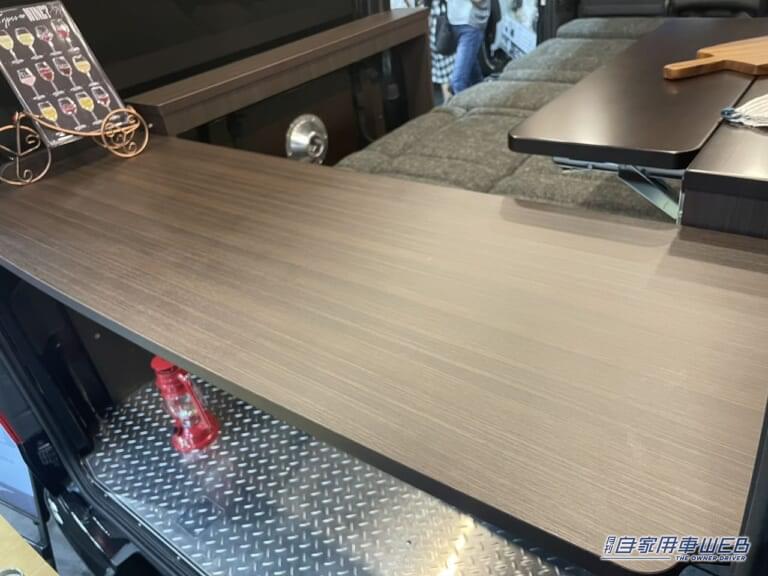 後部は荷物の積載スペースとなっている。フロア部分には縞鋼板が貼られており、ワイルドな雰囲気を演出。その上にはアウトドアの準備などでは便利なテーブルが設置されている。