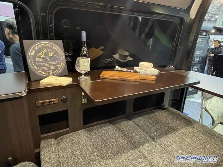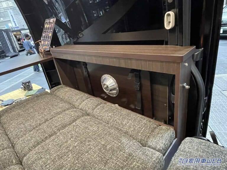 車内右側に位置するのは埋め込み式のシンクと冷蔵庫。コントロールパネルもこちらに配置されている。サイドテーブルは折りたたみ式で、不要な際は邪魔にならない形で簡単に収納できる。ダークブラウンの木目調で統一されたインテリアが高級感を演出。
