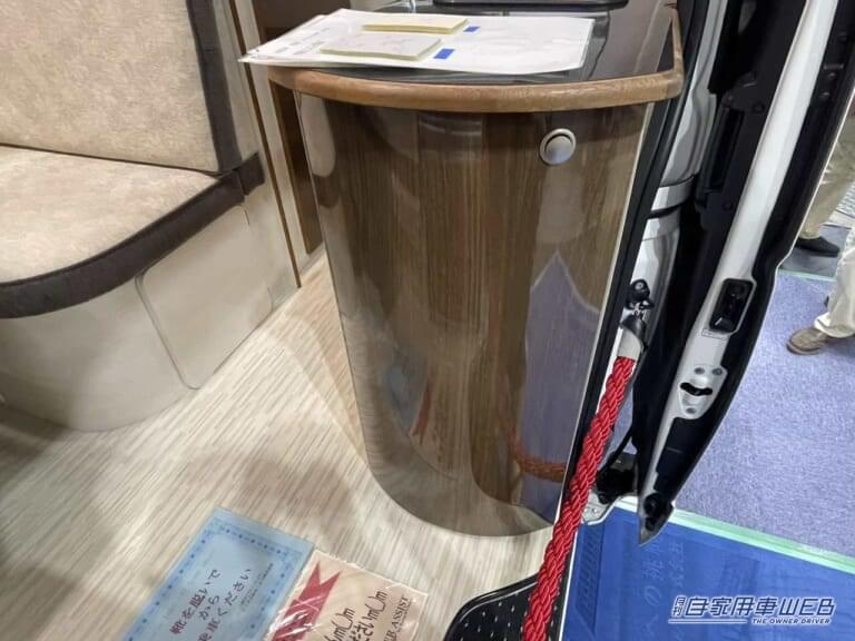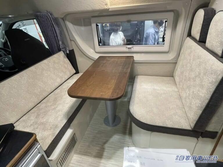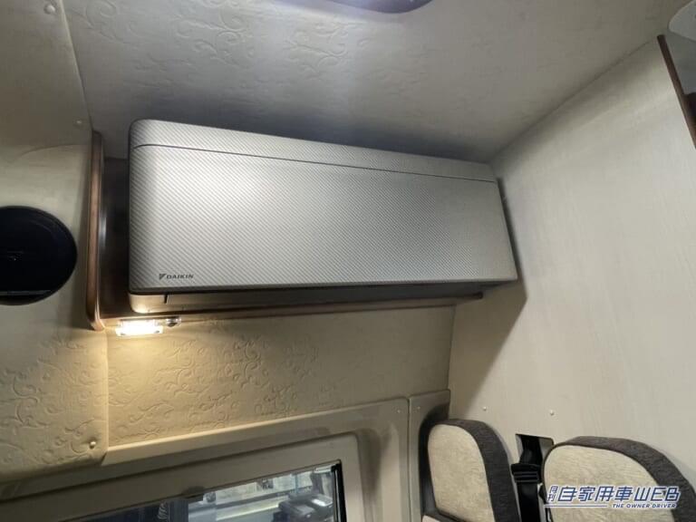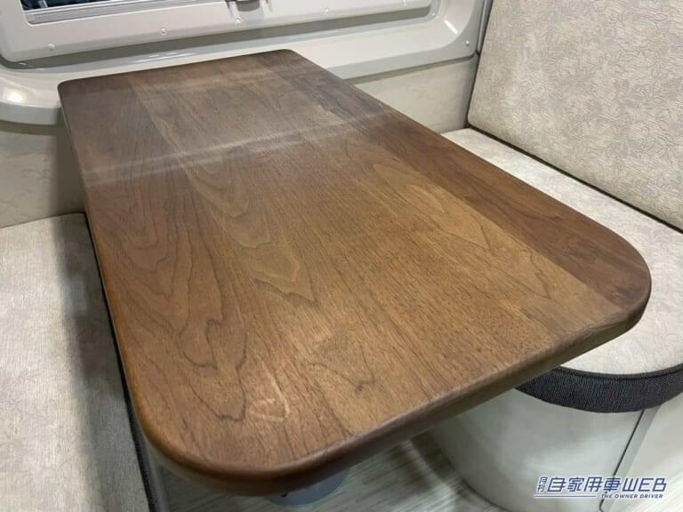 木のテーブルはしっかりとした作りで、本物の家具のような質感。高さの調整も可能だ。ボックスシート上部には家庭用エアコンが設置されており、車内の空調管理は万全。