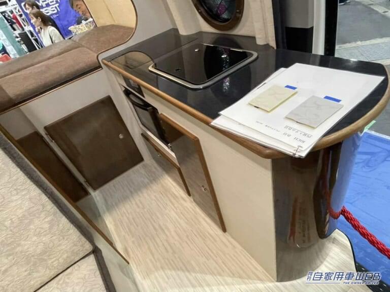 社内左側にはキッチンカウンターが設置されており、IHコンロと埋め込み式のシンクを備えている。