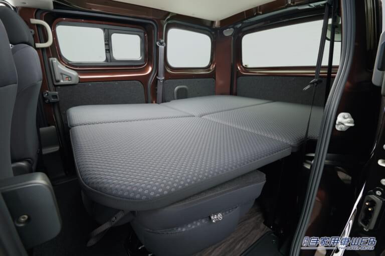 「キャラバン マルチベッド」と同様に、跳ね上げ式のベッドシステムと、硬質素材のフロアパネルを装備し、オプション設定の着脱式テーブルと組み合わせることで、多彩な室内アレンジが可能となるモデル。今回展示するバンベースのモデルでは4WD車も選ぶことができ、ちょっとした悪路にも対応する。さらに、バンベースのモデルでは専用架装オプションも多数ラインアップされている。