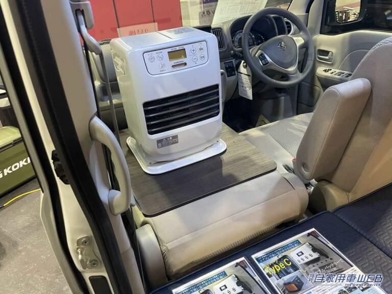 助手席を倒せば小さなフラットスペースが出現。冬場は写真のようにファンヒーターを置くことも可能だ。