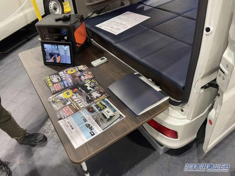 フルフラットのシートは大人2名が寝られる広さで非常に快適だ。また社外で使うことができるテーブルは、ちょっとしたデイキャンプやアウトドアの時に便利。