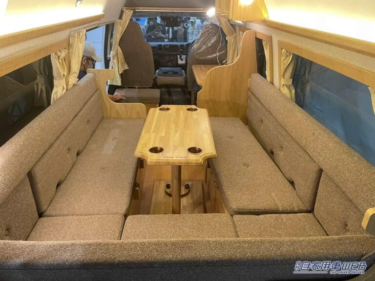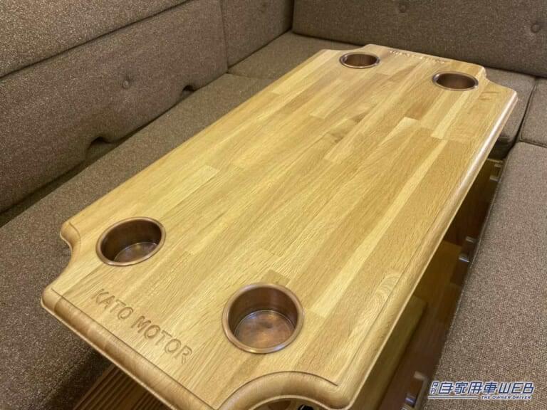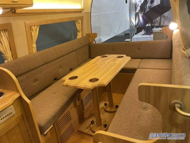 繊維質の生地のシートを採用しており、通気性とクッション性が高く快適だ。車内に馴染むデザインの木目のテーブルは、ドリンクホルダーを4箇所備えている。