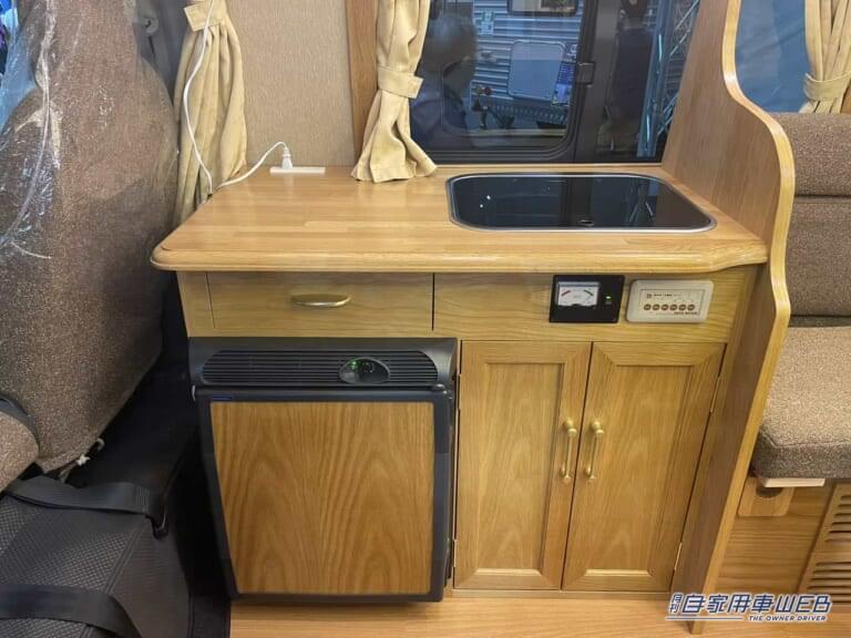 運転席の後ろにはキッチンカウンターが設置されている。冷蔵庫やシンク、電気系統など必要装備はこちらに集約されている。