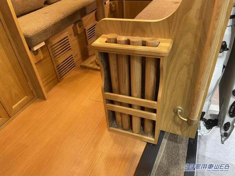 スライドドアの左には小さめの椅子が設置されている。ちょっとした装備であるが、靴を履く際などには非常に便利だ。傘立てにもなるラックに収納されているのはフルフラットにする際に使う支柱だ。
