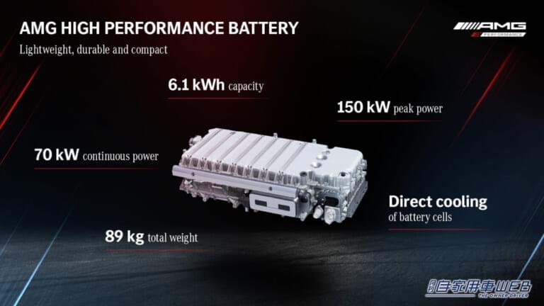 搭載されるハイパフォーマンスバッテリーの容量は6.1kWhで、定格出力70kW、最高出力150kW(10秒間)を発揮する。わずか89kgと軽量であることから、出力密度は1.7kW/kgと高い値となっている。このバッテリーは、航続距離を最大化することより、速やかな放電と充電を行えることを重点に設計されたものだが、EV走行可能距離も12km*と実用的なレベルを確保している。