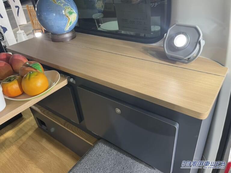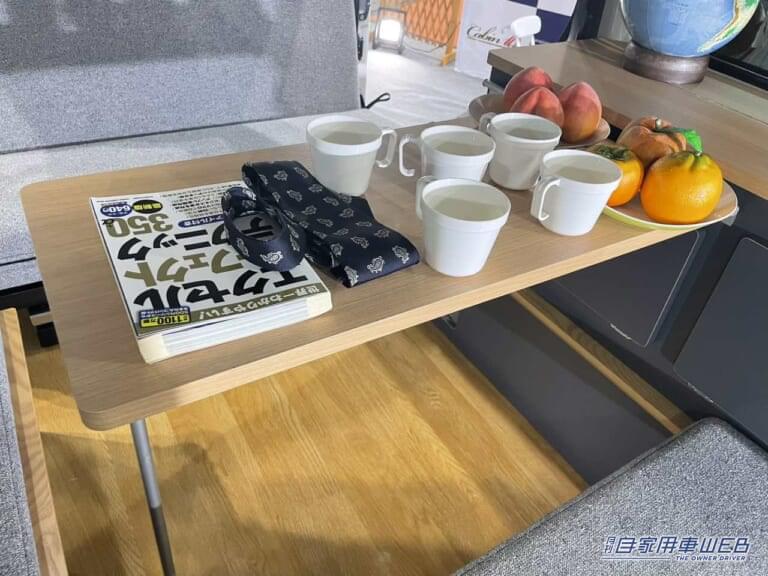 可動式のテーブルは棚に設置する形。使いやすいが邪魔にならない適度な広さだ。