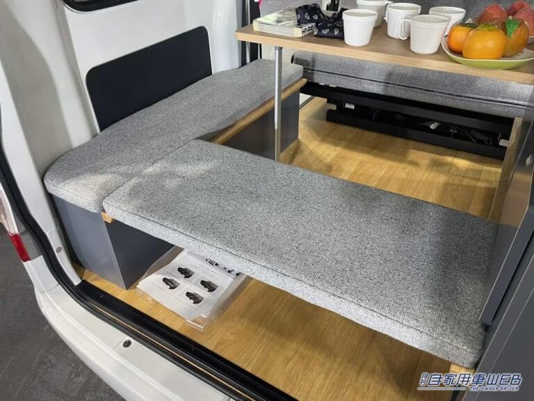 L字のベンチタイプのシートはレイアウト変更もラクラクで、すぐにフルフラットへ切り替えることができる。棚には収納用の扉も設けられており、こちらから荷物の出し入れが可能。