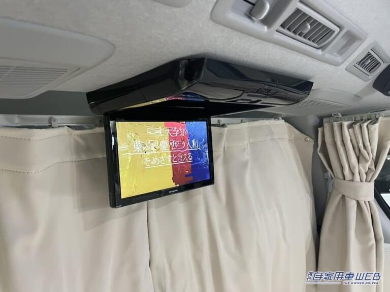 フリップダウンモニターは前方上部に設置されている。1列目のシートとんお後ろにカーテンがあるので、フロントガラス側から車内が見られる心配はない。