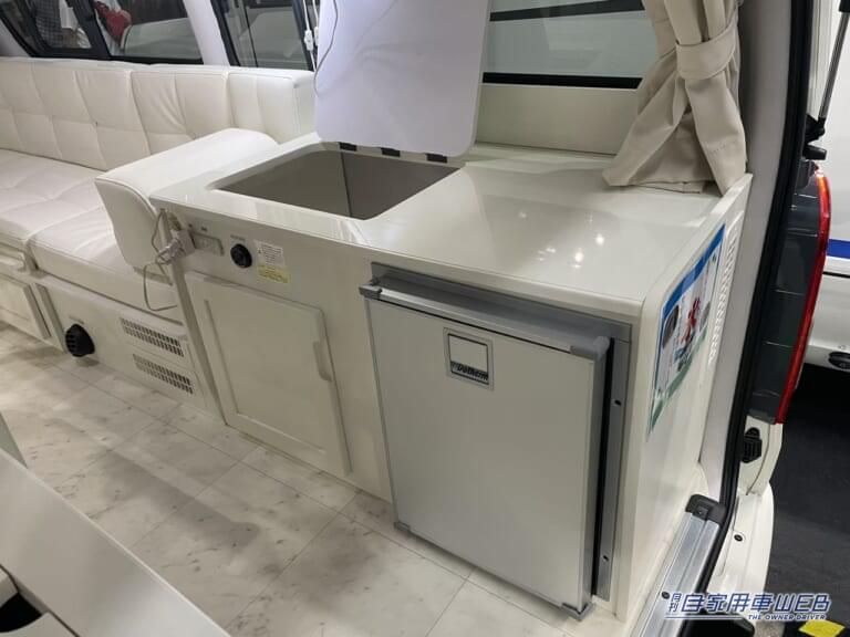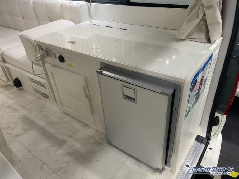 右側には冷蔵庫が埋め込まれたカウンターが置かれている。天板の一部が開くようになっているので、シンクを設置したり収納スペースとして使ったり、用途に応じてカスタムすることも可能だ。