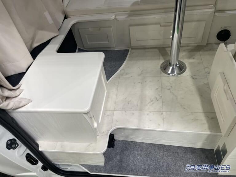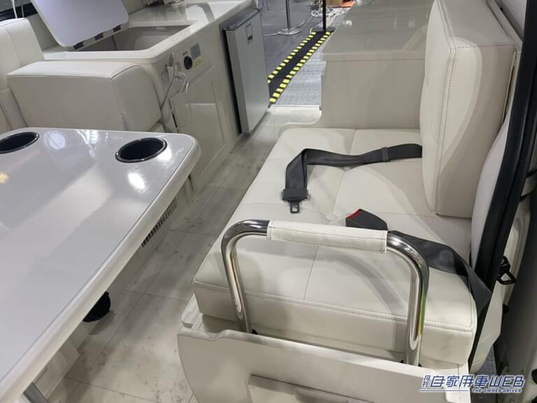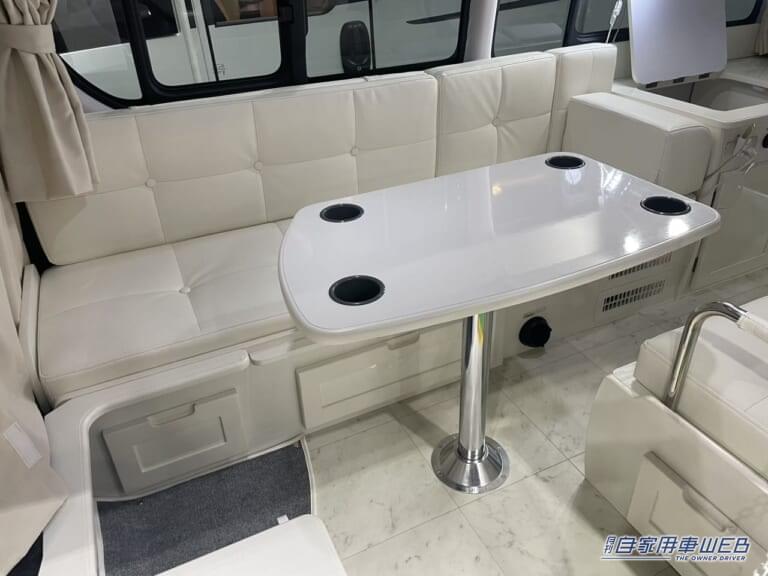 車内右側に位置している白いシートは、水や汚れに強い素材を採用。適度なサイズのテーブルは、立ったり座ったりする際に邪魔にならない大きさだ。
