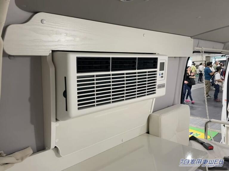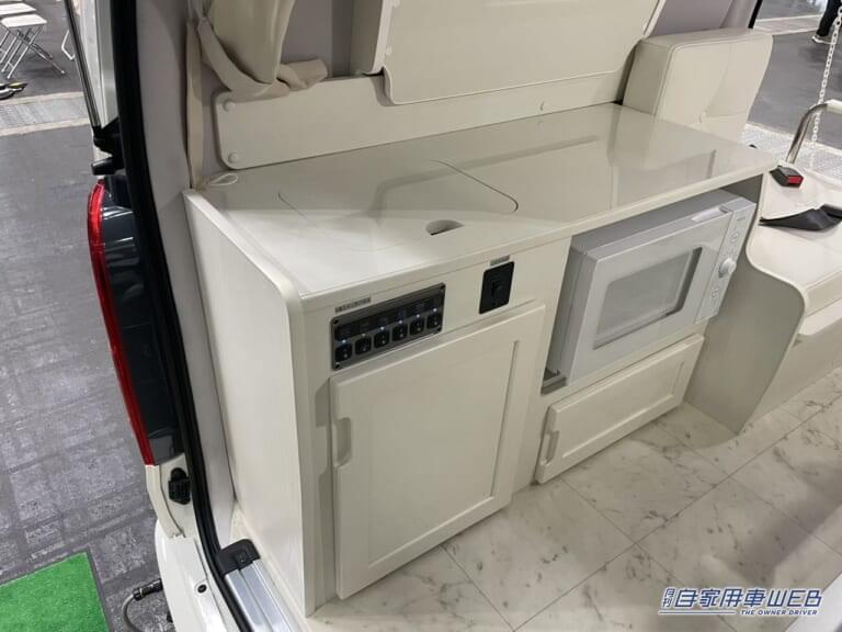 後部の左側にはエアコン、その下には電子レンジが埋め込まれたカウンターが設置されている。