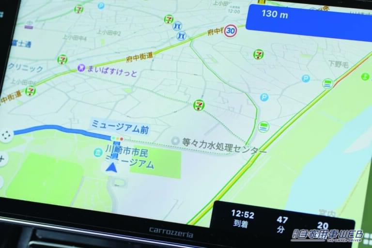 ディスプレイオーディオはカーナビアプリを利用することでAV一体型ナビと同様の機能を発揮するが、都市部の路地や山道、長いトンネルなどでは自車位置の表示が不安定になり、間違ったルートを案内する可能性もある。また、ナビアプリの多くは使用する際に地図データをダウンロードするので他のアプリに比べてデータ量の消費が激しく、スマホの契約プランによっては想定以上の通信料金が発生することもある。その一方でつねに最新地図データを用いるため、新たに開通した道路を活用した効率的なルート案内ができたり、新規オープンの施設を検索できるといったメリットがある。