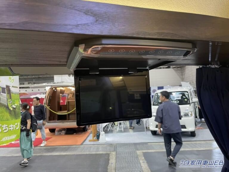 また上部にはフリップダウンモニターを設置。照明のついた上部の棚は間接照明のようになっており、強い光が視界に入らず目に優しい。