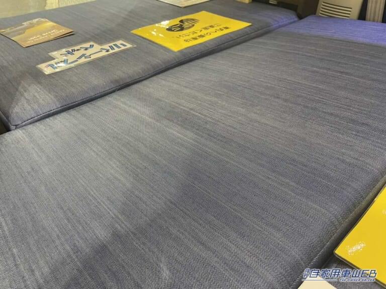 ブルーのフラットシートは広々としており、大人2名が横になることができる。クッション性も高く快適だ。