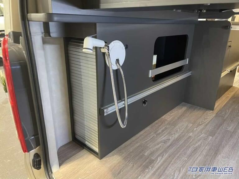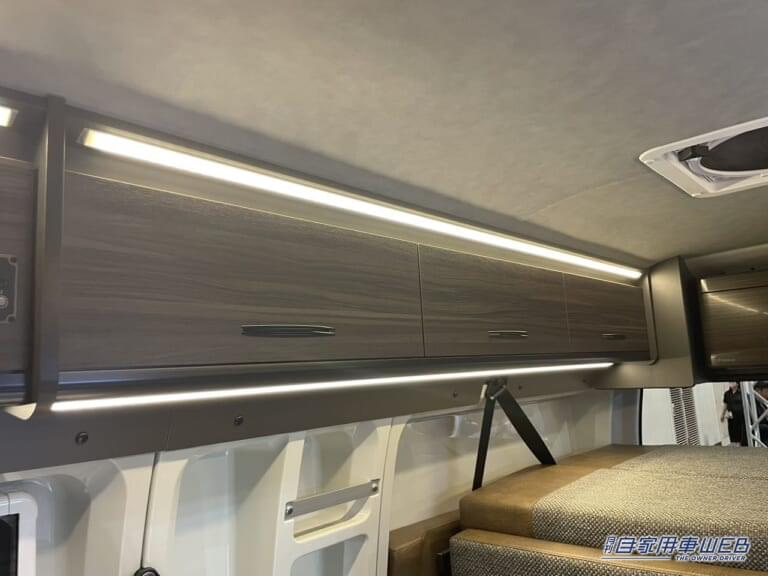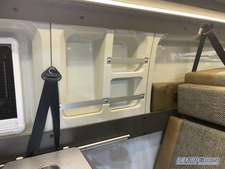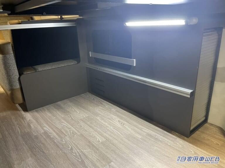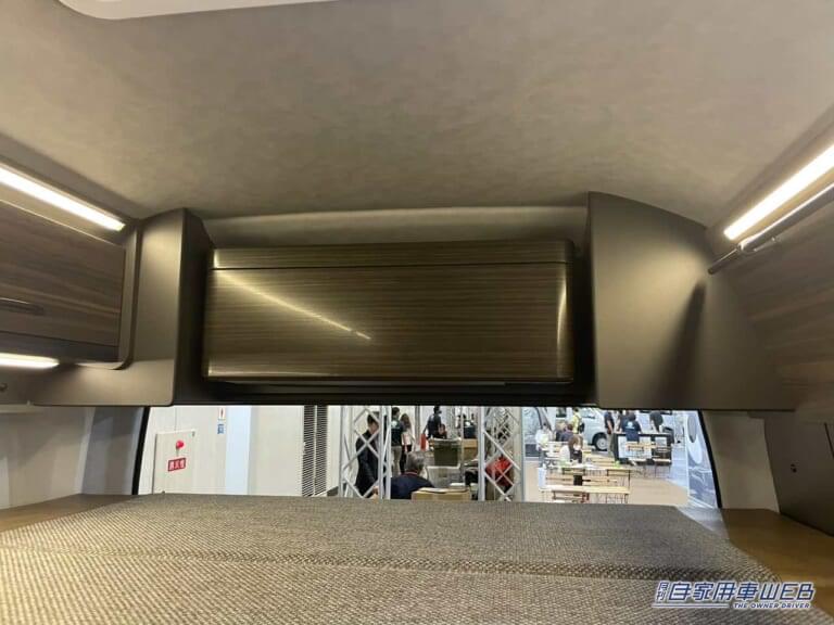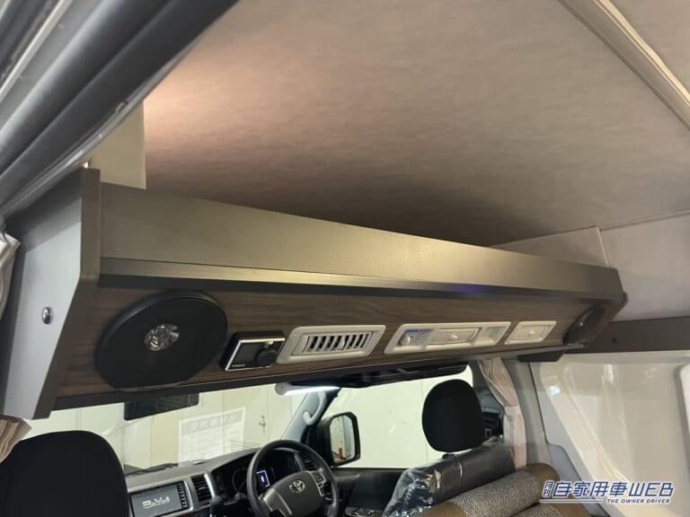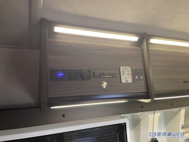 また車内上部にはコントロールパネルと収納棚が。ベッドを展開した場合でも使いやすい位置に配置されていることがわかる。