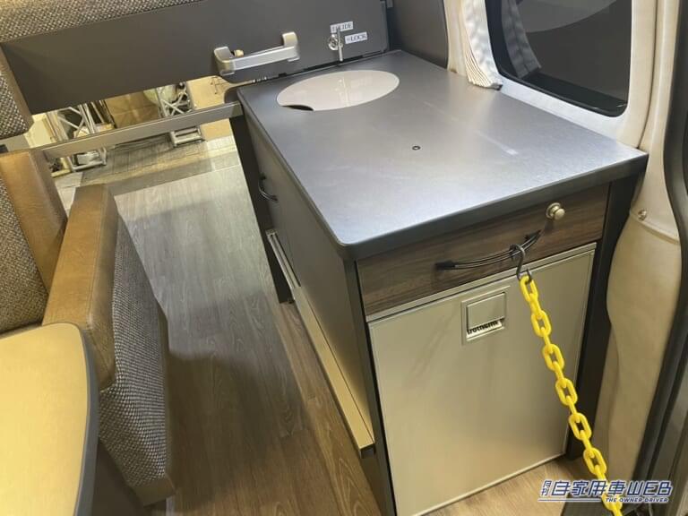 車内左側には冷蔵庫とシンクが埋め込まれたキッチンカウンターを配置。