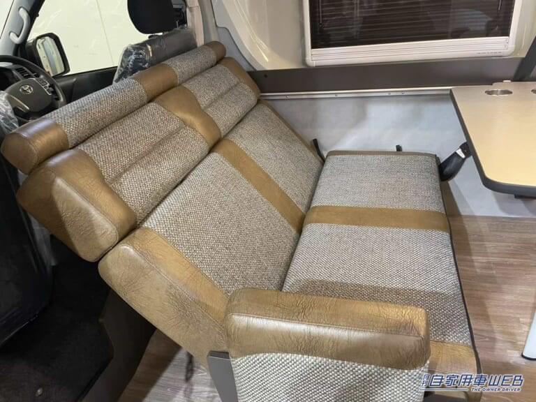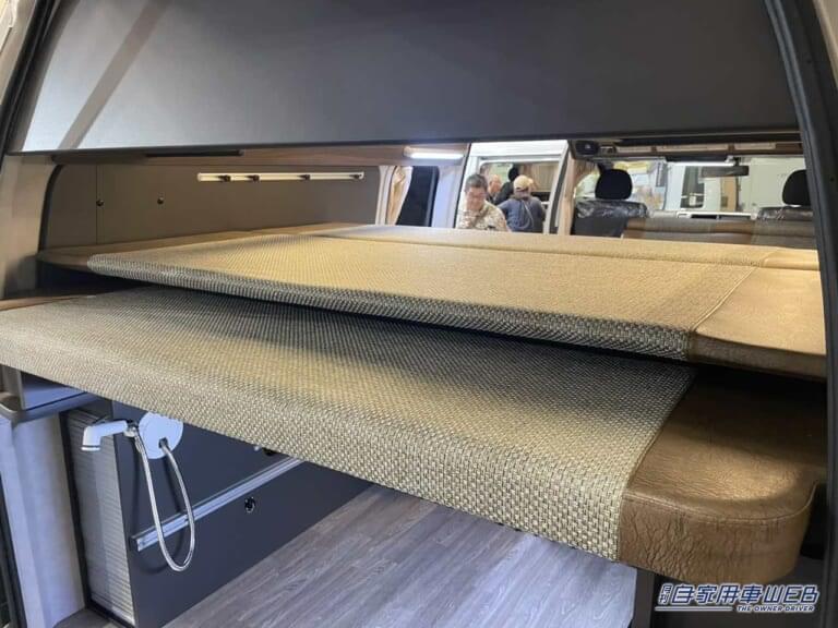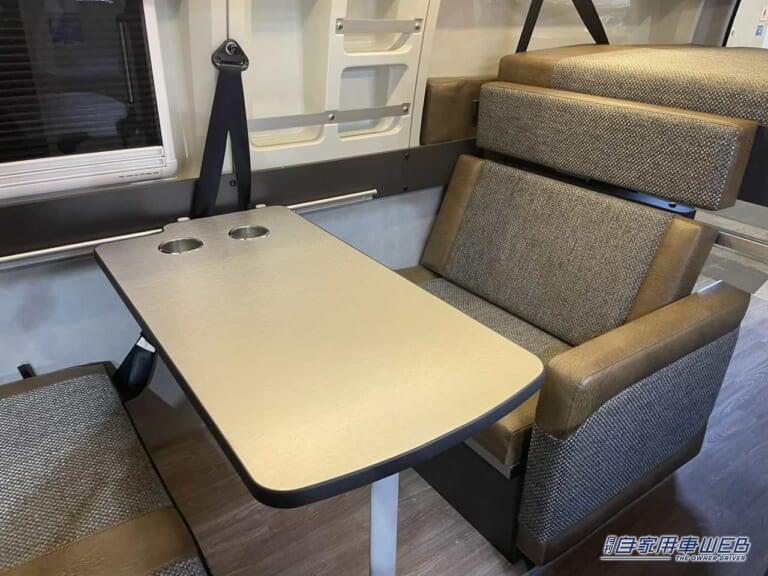 2列目のシートの向かいにはテーブルと3列目のシートが設置されている。2列目と3列目のシートをフラットにすれば就寝用スペース(下段)となる。