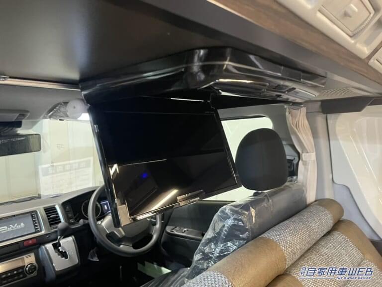 運転席後ろの天井には、スピーカーとフリップダウンモニターが設置されている。