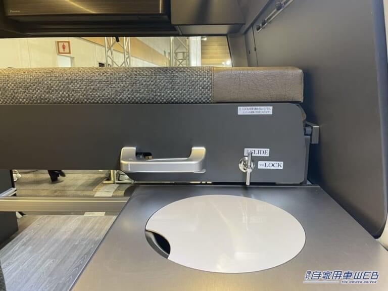 キッチンカウンター奥のレバーを引けば、フラットシートがスライドして、就寝用スペース(上段)をすぐに展開できる。