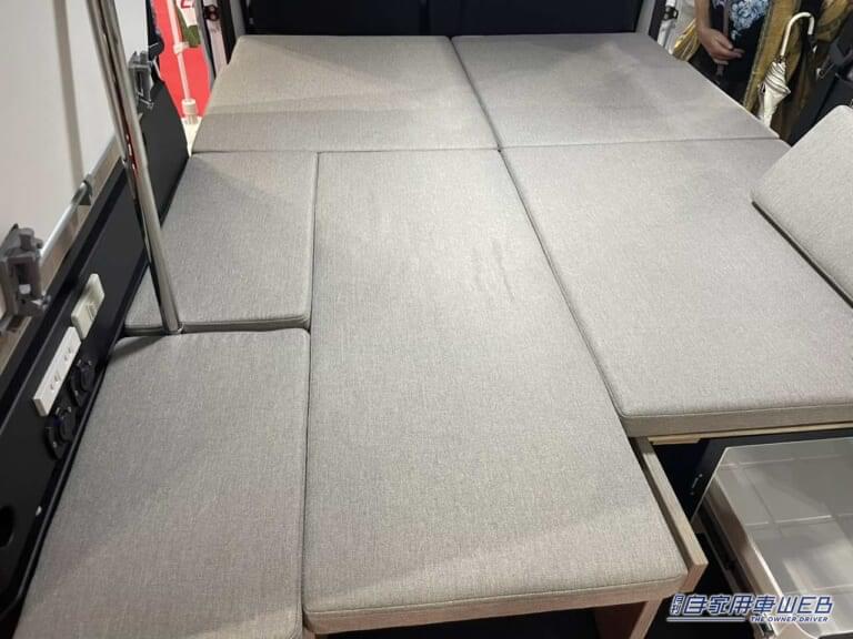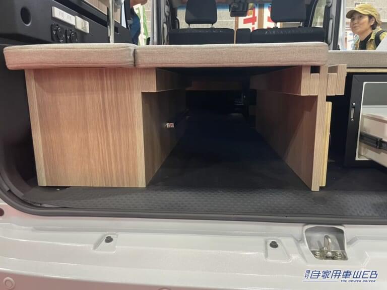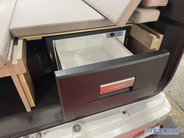 シート下左は収納スペース、右は冷蔵庫となっている。レシート下の冷蔵庫はフラットにした写真のようなレイアウトでも取り出しやすい。車外でアウトドアを楽しむ際にも、バックドア側からすぐにアクセスできるので非常に便利だ。
