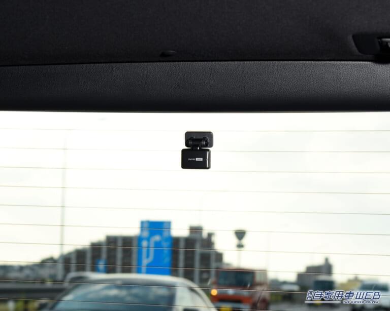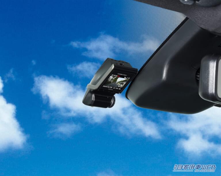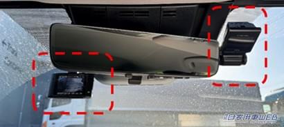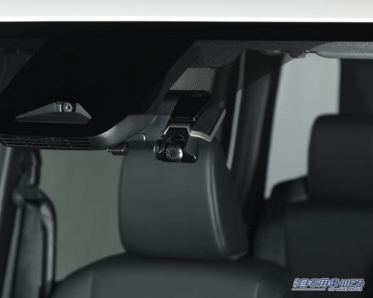 安全運転支援システム等で大型化するルームミラー部周辺への設置を想定して、視界の妨げになりにくいフロントガラス貼付けタイプを採用。吊り下げタイプに比べ、フロントガラス上部への取付けが可能なため、よりスッキリした視界を確保可能に。また、カメラとフロントガラスとの距離が近いため、映り込みも抑えられるという。