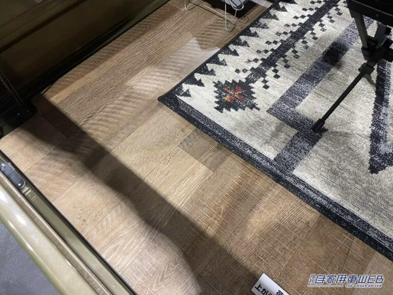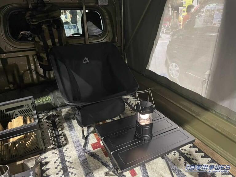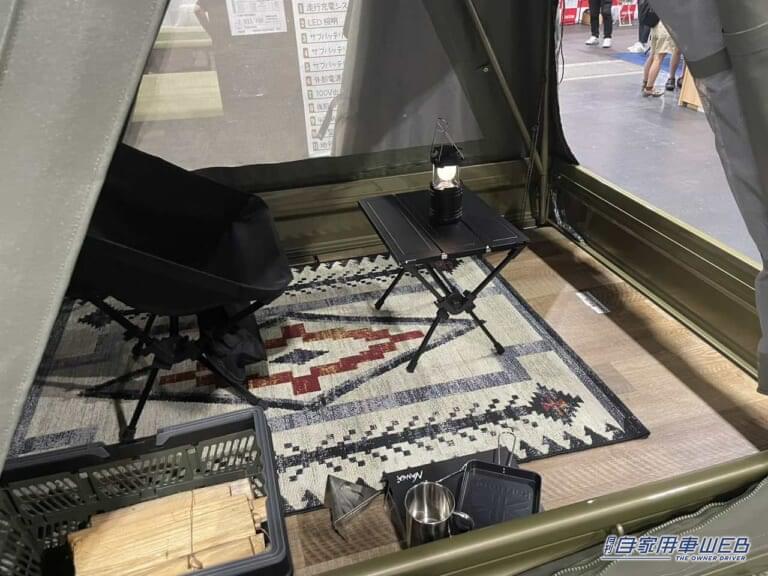 フロアには木目のシートとネイティブがらのブランケットが敷かれていた。椅子とテーブルも設置されており、荷台がそのままソロキャンプのベースとなっていた。