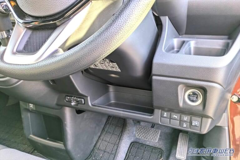 運転席からすぐ手が届く箇所には、ハンドルの下の小物入れやハンドル右のドリンクホルダーなどがあり、運転中に使用するサングラスやお財布を置くのに便利ですね。