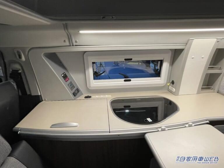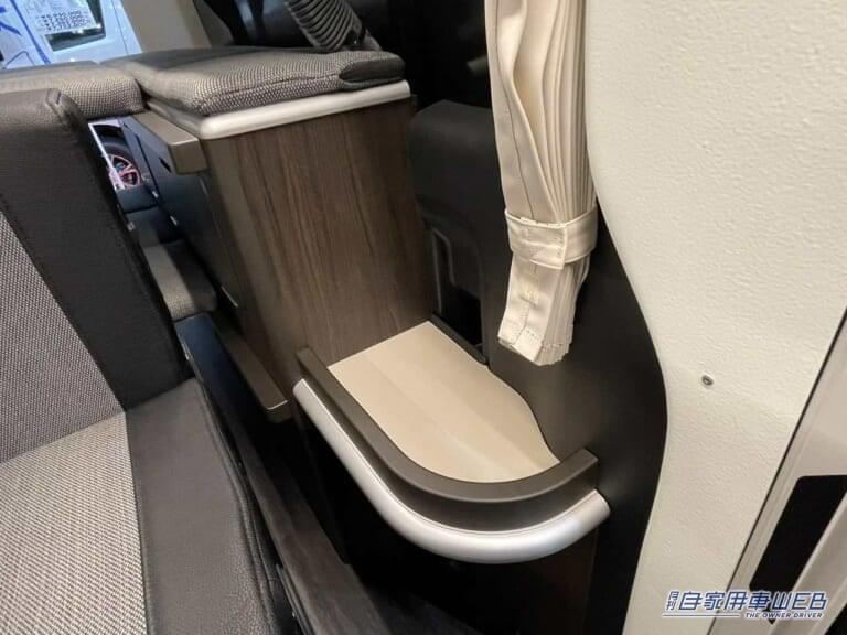 テーブルの下にはカウンター収納部分にアクセスできる扉が設けられている。3列目のシート横には小物を置くスペースが作られている。ちょっとしたスペースだが、これがあると非常に便利。