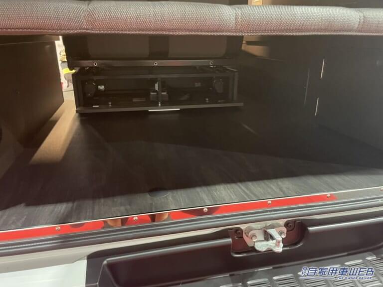 下段はシートと同じ素材が採用されており、高さのない荷物を積むには最適なスペース。フロアは水や汚れに強い素材を使用しているので、アウトドアギアなどはこちらに収納するのがおすすめだ。