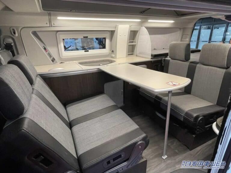 車内は前部にボックスシートとキッチンカウンターが設置されている。