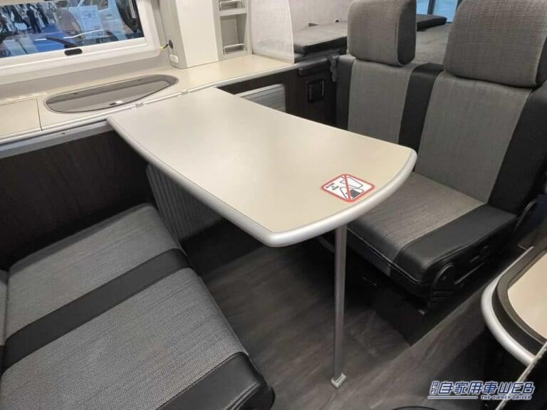 可動式のテーブルは展開・撤収が簡単にできる作り。キッチンカウンターにはシンクや冷蔵庫が埋め込まれており、ボックスシートに座った状態でアクセスできる。