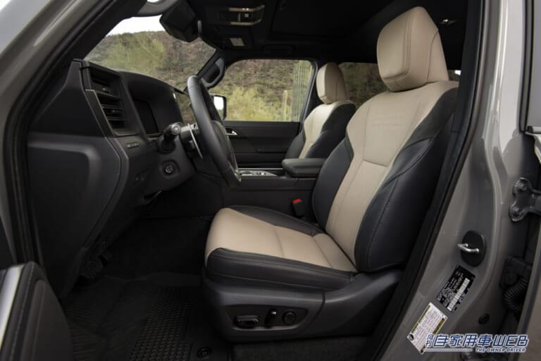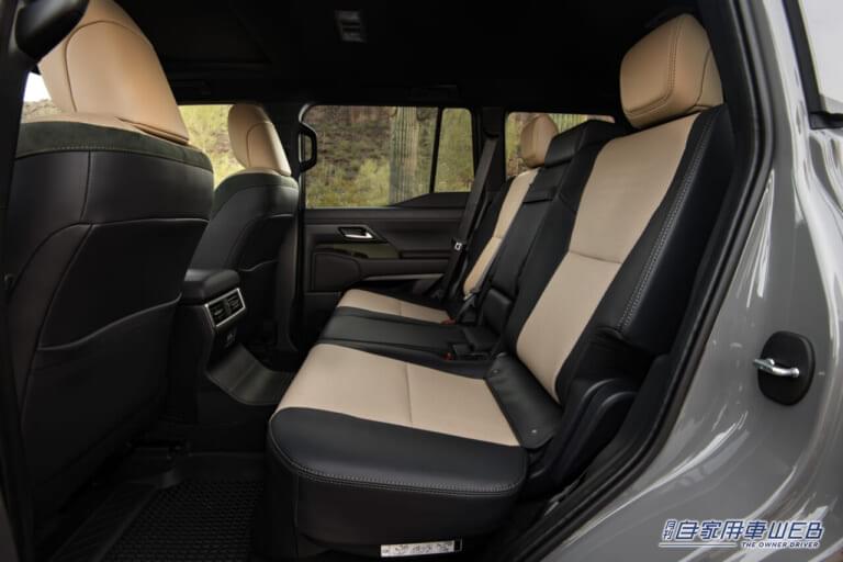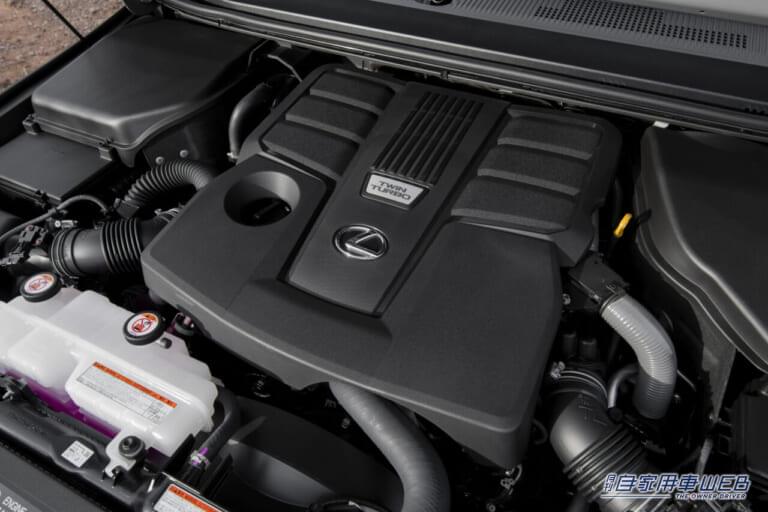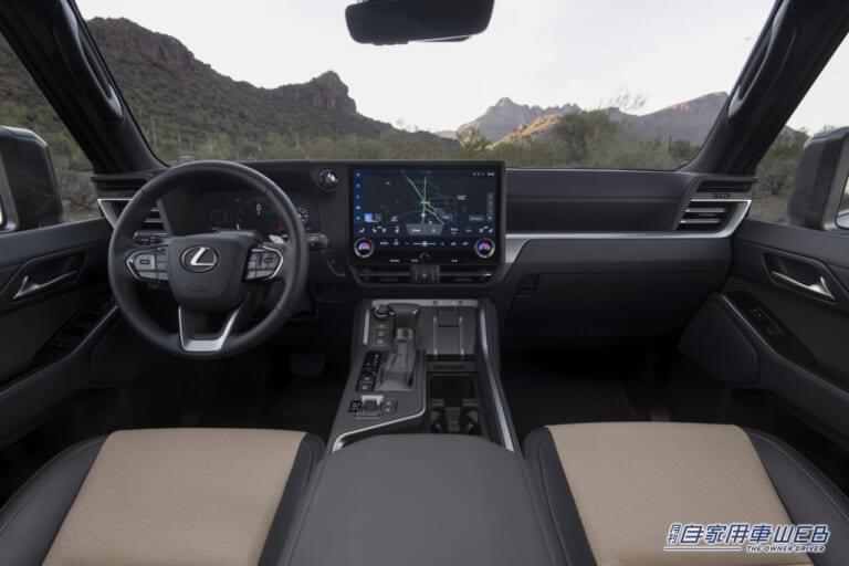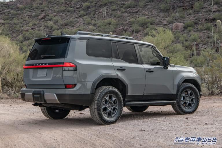 パワートレーンはLX譲りのV6-3.5L直噴ツインターボ(415PS/650Nm)+10速ATだが、小型タービン&専用制御によりレスポンス重視の特性に。シャシー系は基本素性に優れるGA-Lプラットフォーム+強化されたボディの組み合わせに加えて、専用セットのAVS、LX譲りのEPS、ランクルGRスポーツ譲りのE-KDSS(前後スタビライザーを電子制御)と、トヨタ/レクサスの本格オフローダーに与えられた武器をフル装着する。