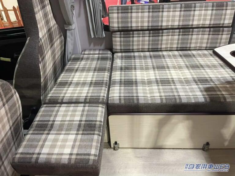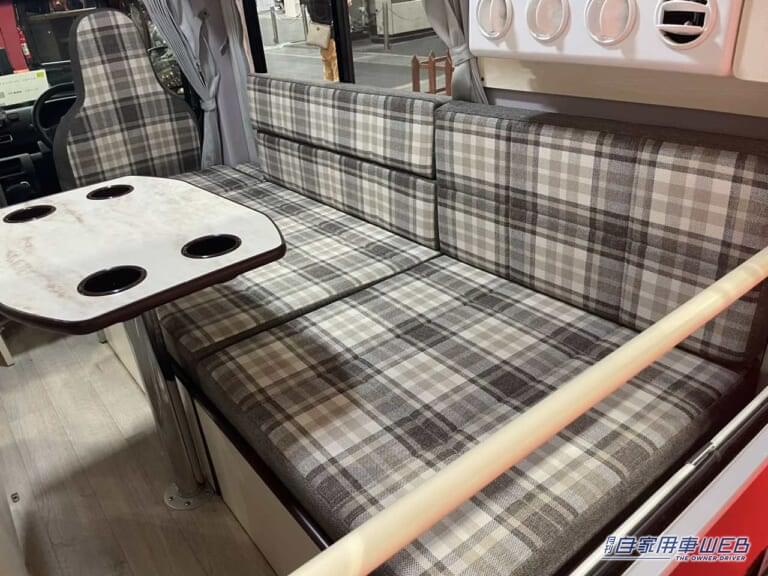 車内前部から左側にかけてL字に設置されたシートは、グレーのチェック柄の生地が採用されている。