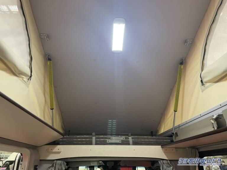 ポップアップルーフを展開すれば2名分の就寝スペースを確保することができる。底板を敷かなければ天井も高くなり、車内で立つことも可能だ。