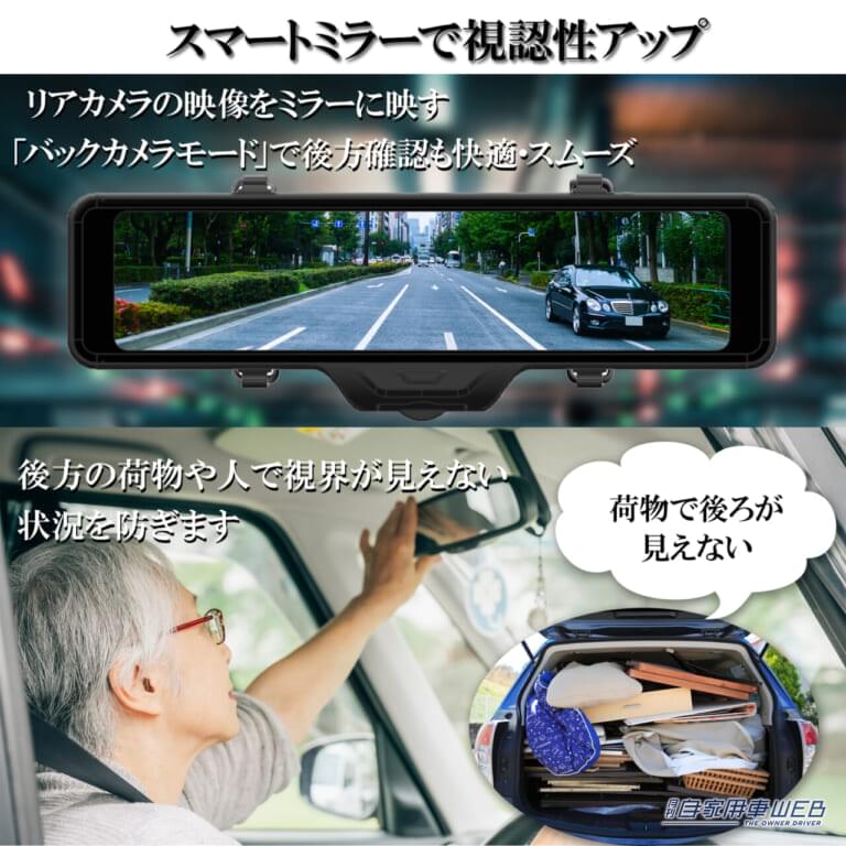 スマートミラー下部に内蔵の360°カメラで車内外を全方位で録画し、更にセパレートのフロント+リアカメラで前後をピックアップし鮮明に録画可能。極限まで高めた広範囲録画を実現し、決定的瞬間を逃さない。