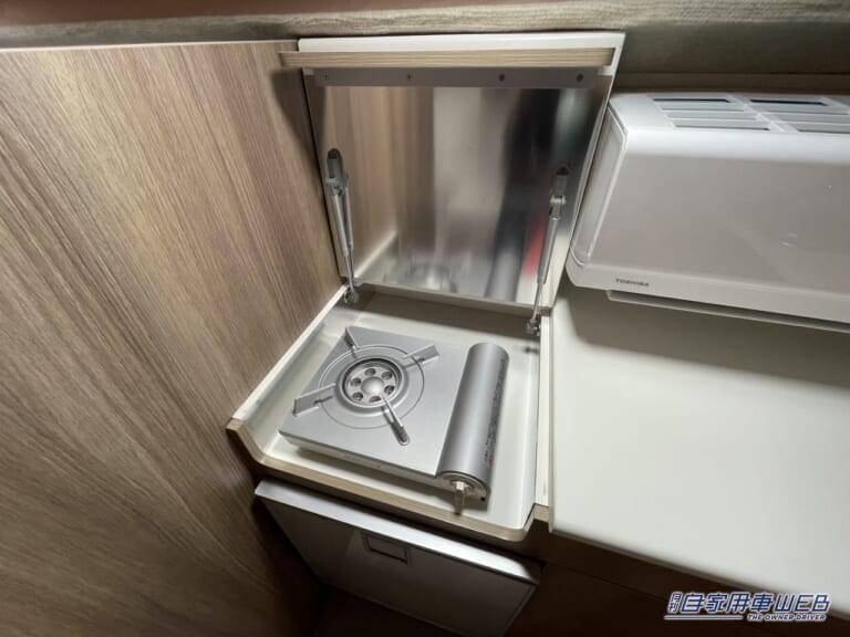 ガスコンロを使わない際は蓋をしてフラットにすることが可能。シンクは入り口に近い場所に位置している。