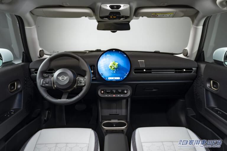 エレガントでミニマルなインテリア デザインは、クラシックな Mini からインスピレーションを得ているという。新しいステアリングホイール、円形OLEDディスプレイ、典型的なMINIトグルバー、ツートンカラーのテキスタイルダッシュボードがコックピットに開放感を生み出し、広々としたスペースを備えたモダンなインテリアとなっている。また、後部座席を6:4の比率で倒すと、荷室容量は210ℓから最大725ℓに拡張可能だ。