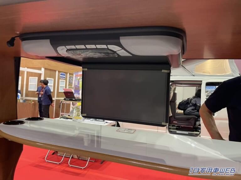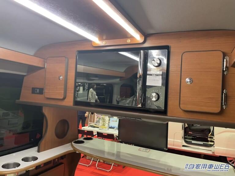 車内後方の上部には電子レンジが、その下にはフリップダウンモニターが設置されている。